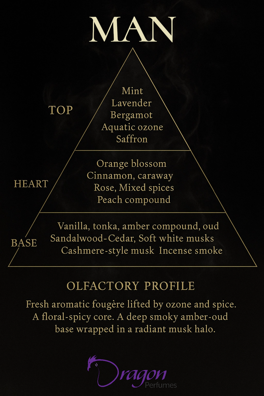 The opening strikes sharp and luminous: mint, lavender, and bergamot awaken the senses as a clean current of aquatic ozone and a touch of saffron thread through the air. In its heart, orange blossom and rose rise through cinnamon, caraway, and mixed spices, balancing warmth with structure.