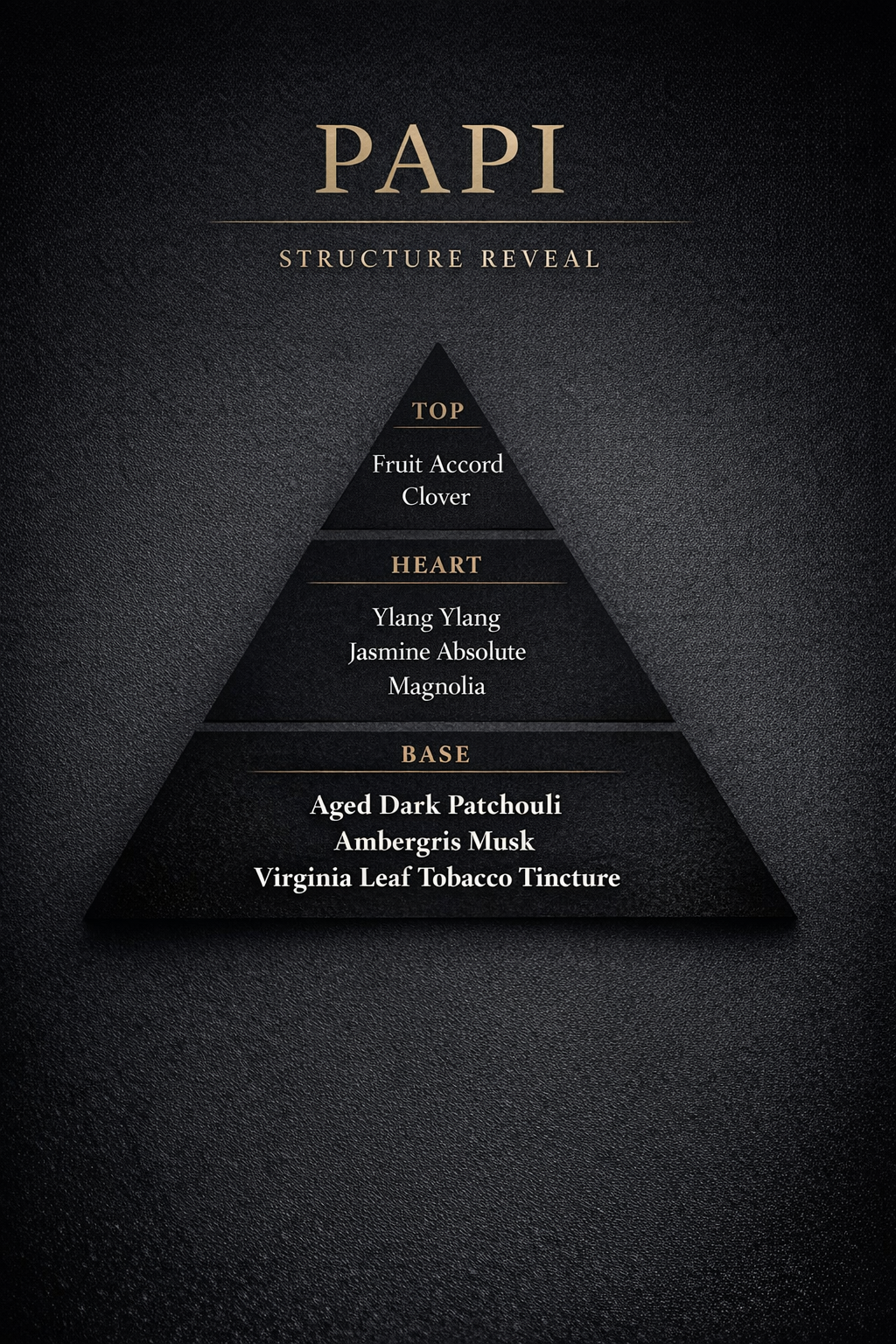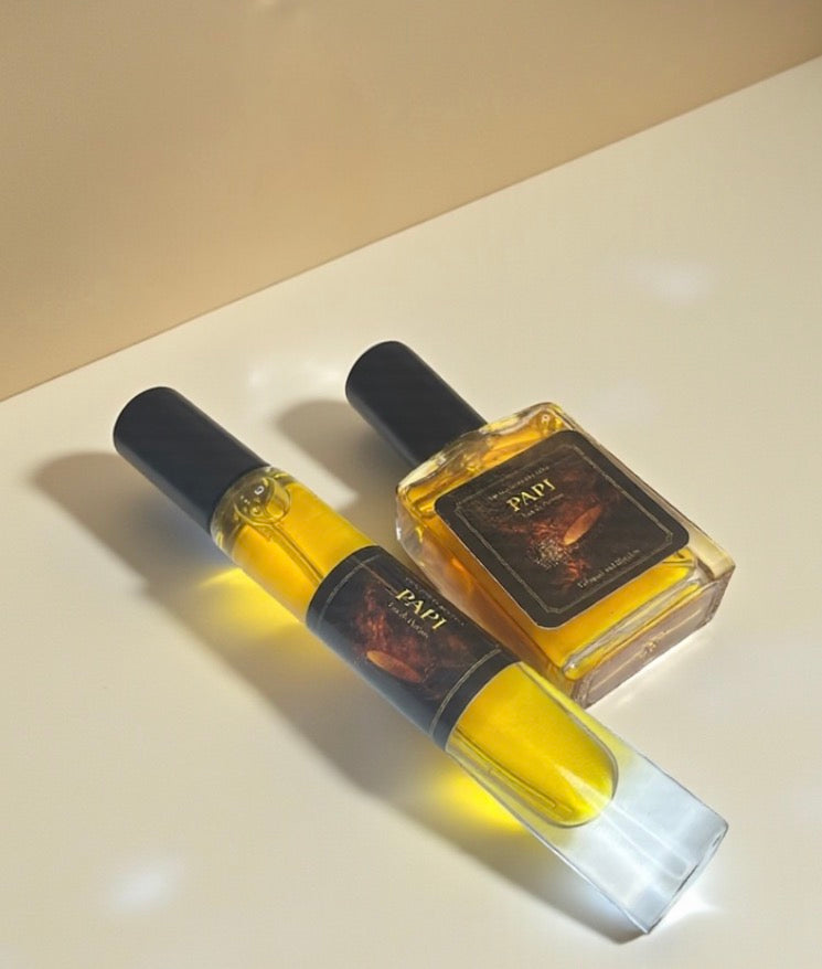 A deliberately simple structure built from aged materials and slow tinctures. PAPI is grounded in aged dark patchouli, ambergris musk, and a custom-made Virginia leaf tobacco tincture. Minimal florals soften the edges through Ylang Ylang, jasmine absolute, and magnolia. The opening is brief and restrained, shaped by a subtle fruit accord and a touch of clover. It develops quietly on skin, revealing depth through time rather than immediacy.
